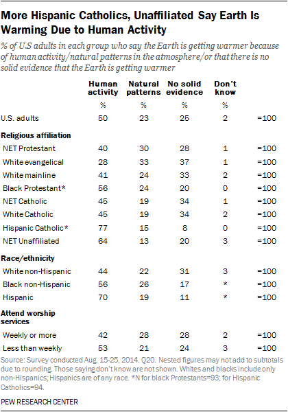 Overall, 50% of adults say climate change is occurring mostly because of human activity such as burning fossil fuels, 23% say climate change is occurring due to natural patterns in the Earth’s environment, and 25% say there is no solid evidence that the Earth is warming. -Religion and Views on Climate and Energy Issues, pewinternet.org